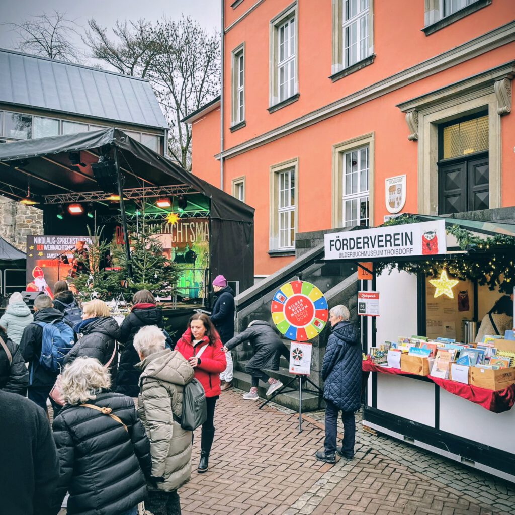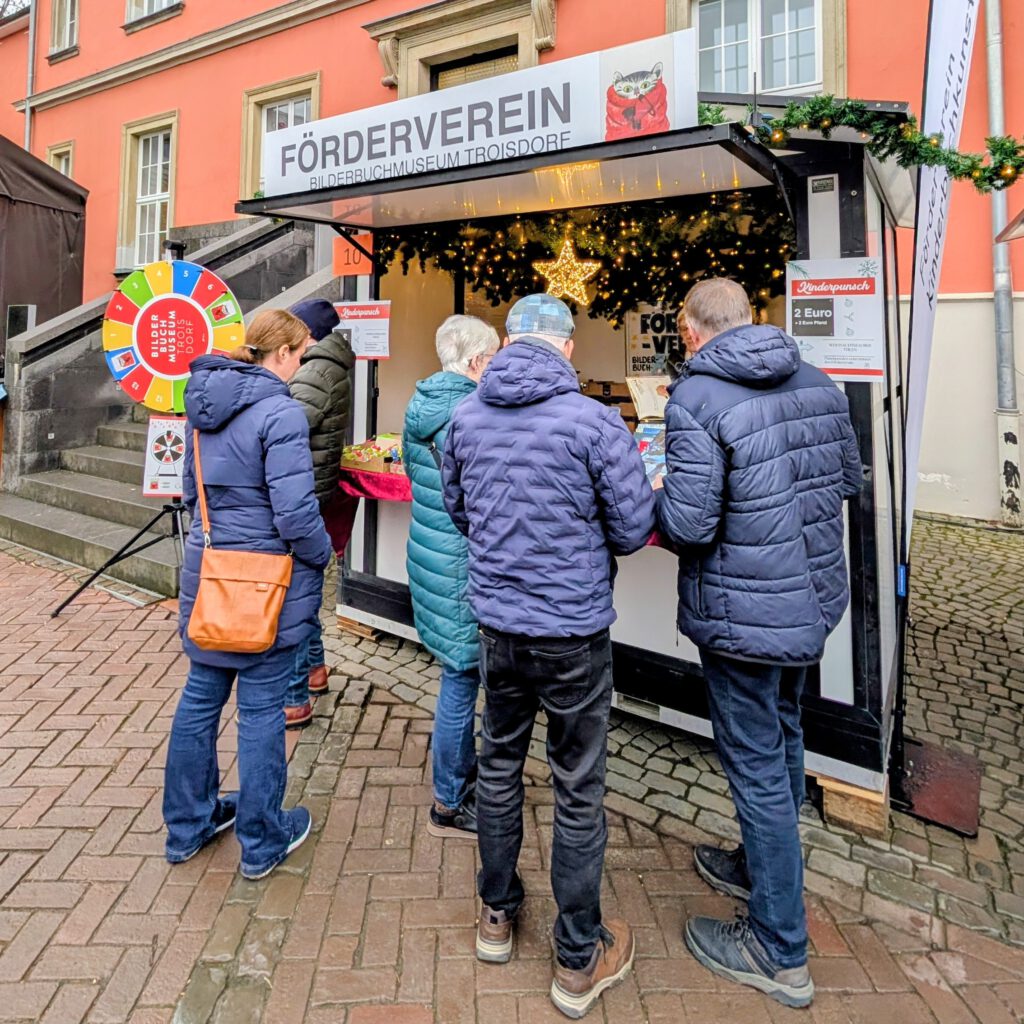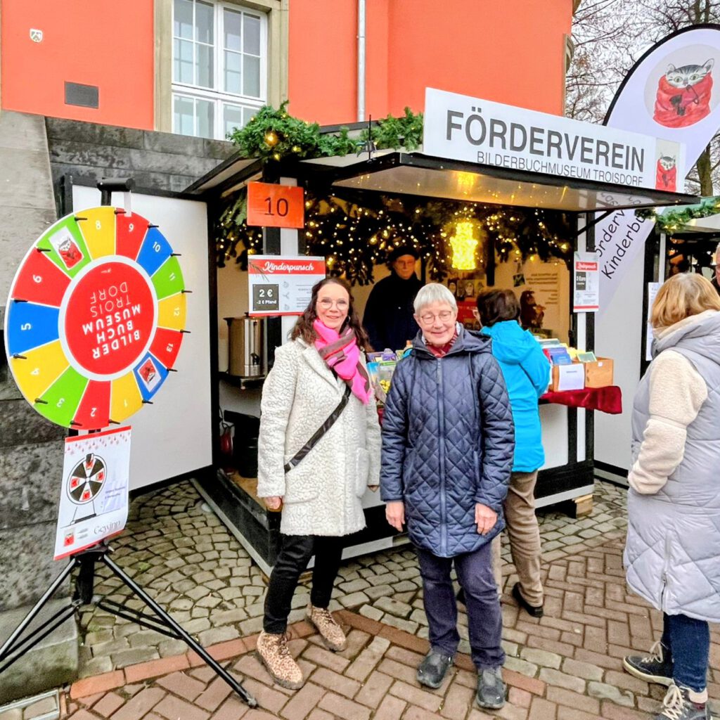 Der Förderverein des Bilderbuchmuseums blickt auf einen rundum gelungenen Weihnachtsmarkt an der Burg Wissem zurück. An allen Markttagen war der Stand des Fördervereins ein beliebter Treffpunkt für große und kleine Besucherinnen und Besucher und zeigte damit einmal mehr, welchen Stellenwert das Bilderbuchmuseum in Troisdorf und darüber hinaus genießt.