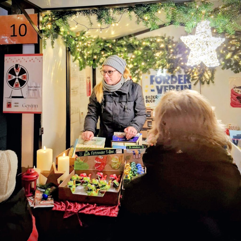 Mit viel Interesse und Begeisterung wurde am Stand gestöbert und entdeckt. Die wundervoll illustrierten Bücher luden zum Verweilen ein und fanden zahlreiche neue Besitzerinnen und Besitzer. Auch der Kinderpunsch erfreute sich großer Beliebtheit und trug ebenso wie der Buchverkauf dazu bei, die Arbeit des Fördervereins zu unterstützen. Ein besonderer Publikumsmagnet war erneut das Glücksrad, das für viel Freude bei den Kindern sorgte und Menschen jeden Alters zum Mitmachen einlud.